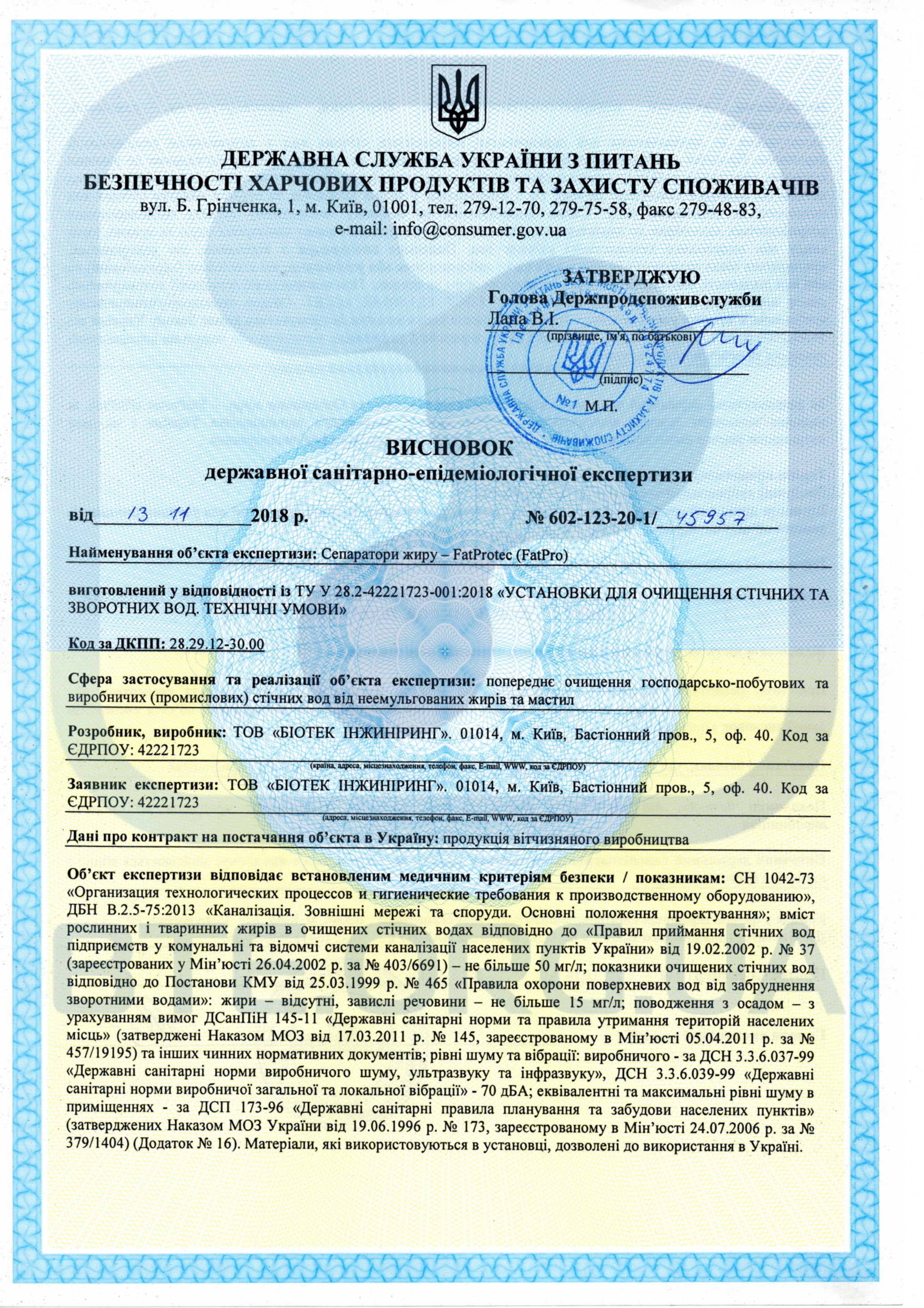 Висновок на жировловлювач FatProtec