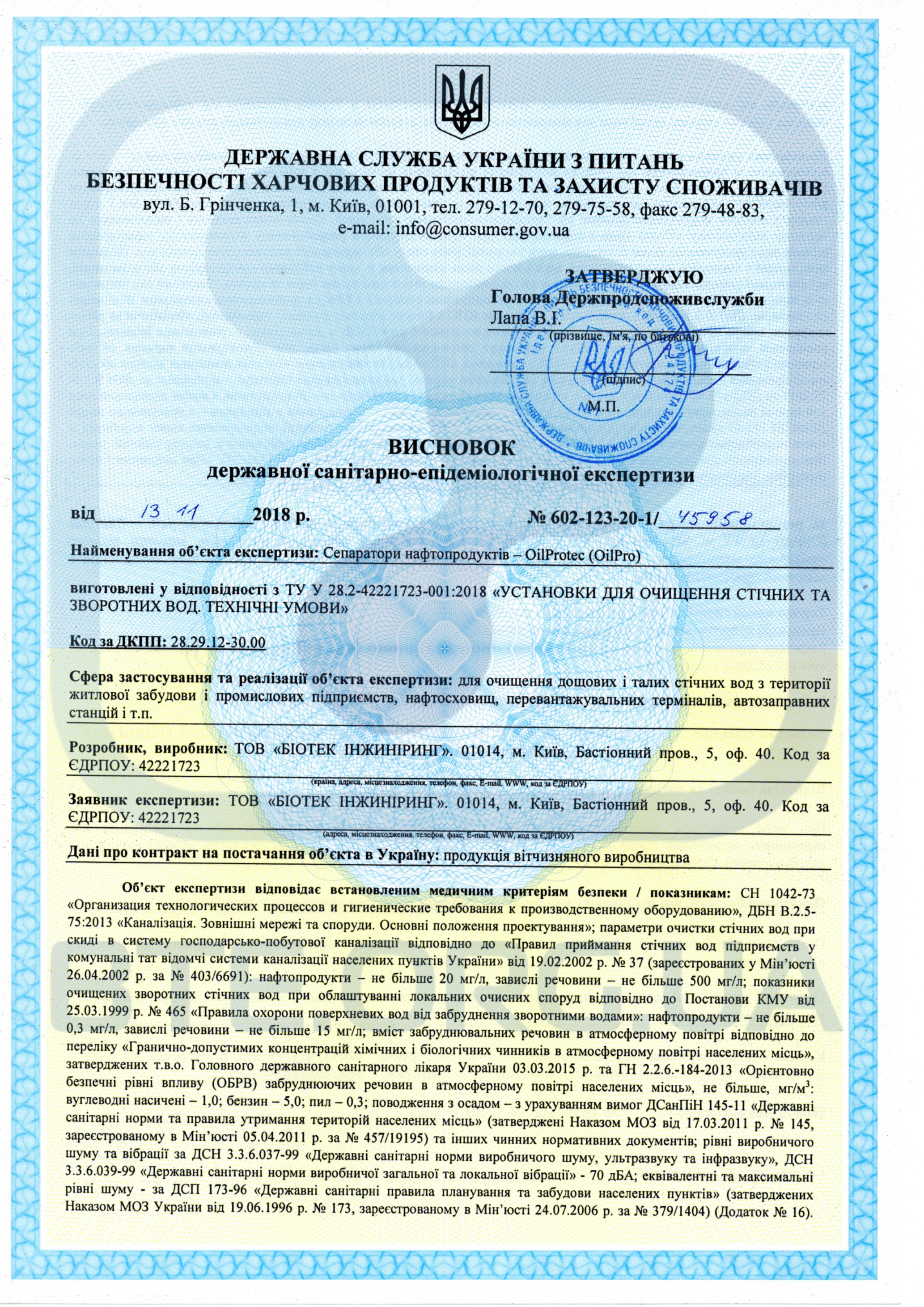 Висновок на нафтовловлювач OilProtec