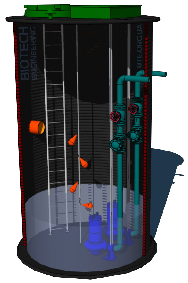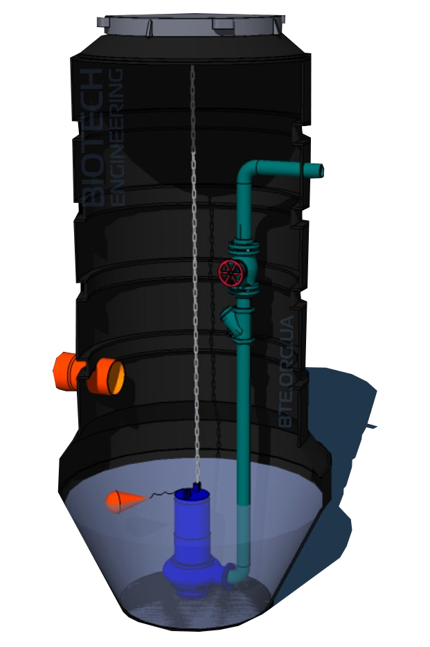 Виготовлений з поліетилену ротаційної форми, є насосною станцією перекачування стічної води на об'єктах невеликої потужності. Усередині станції розміщують трубопроводи, насосне обладнання, запірно-регулювальну арматуру та систему контролю рівня рідини. Для забезпечення зручності обслуговування, насосна станція має герметичний круглий люк, шафу для налаштування роботи та решітку.