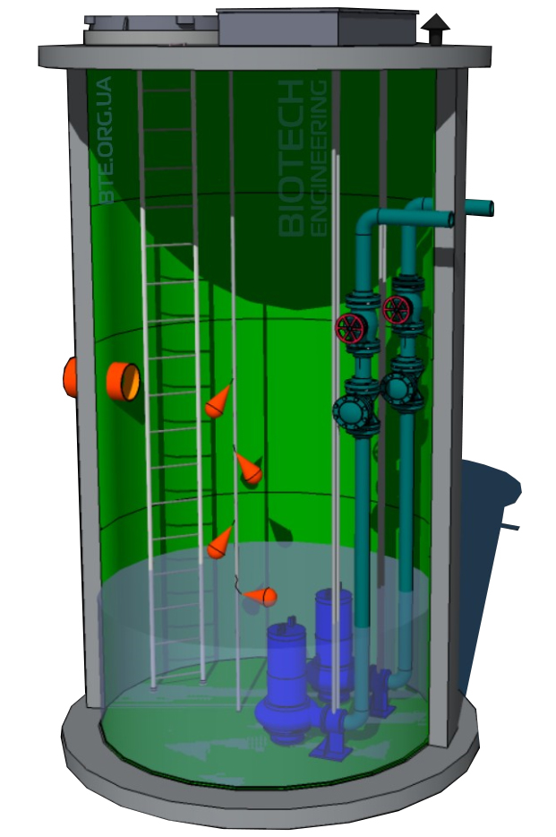 Це насосна станція для перекачування фекальної води, що монтується в залізобетонні заводські кільця з ПЕ вкладишем. Після установки залізобетонного колодязя, вкладиші зварюються між собою для герметичності резервуару. Колодязь має трубопроводи, насосне обладнання та систему контролю рівня рідини. Насосна станція має герметичний залізний люк та шафу автоматичного управління та решітку.