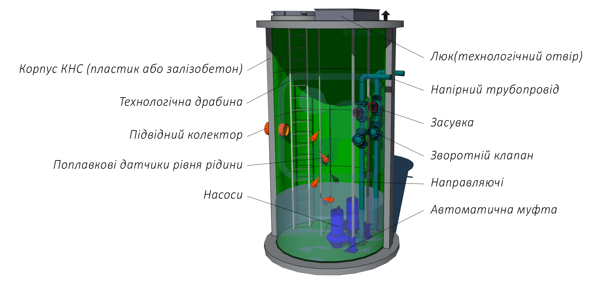 Циліндричний резервуар, виготовлений з герметичної стільникової поліетиленової конструкції на базі ПЕ труби. Усередині резервуару монтуються трубопроводи, насос для каналізації, запірно-регулювальна арматура та система контролю рівня рідини. Для обслуговування насосної станції буде облаштований герметичний люк, який запобігає просоченню неприємних запахів та шафа автоматичного управління з програмним забезпеченням. Також перед системою КНС буде встановлена решітка для затримання сміття. Облаштовуються сходи та технологічний майданчик. Цей тип системи КНС підходить для встановлення в різних умовах, таких як високий рівень грунтових вод, сейсмічні зони та на об'єктах з глибоким підведенням колектору К1.