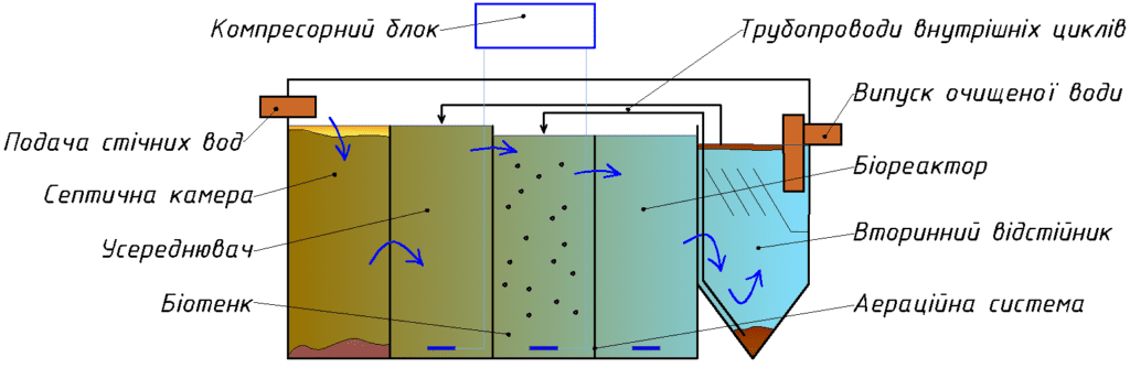 Напірним або самоплинним колектором неочищені стічні води потрапляють у приймальний відсік очисних споруд – септичну камеру. Вона виконує функцію механічного та попереднього анаеробного (без доступу повітря) біологічного очищення стічних вод. Септична камера містить зону для накопичення важких мінеральних домішок (піскуному біореакторі відбувається окислення органічних сполук та азоту за участю аеробних мікроорганізмів. Цей процес відбувається за наявності доступу повітря. Після цього стічна вода потрапляє до відстійника, де завислі речовини відокремлюються від очищеної води.