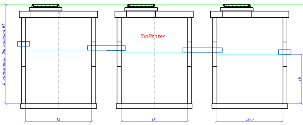 | Діаметри колодязів | D1, м | 1.5 | 1.0 | 1.5 | 2.0 | 2.0 | 2.0 | 2.0 |