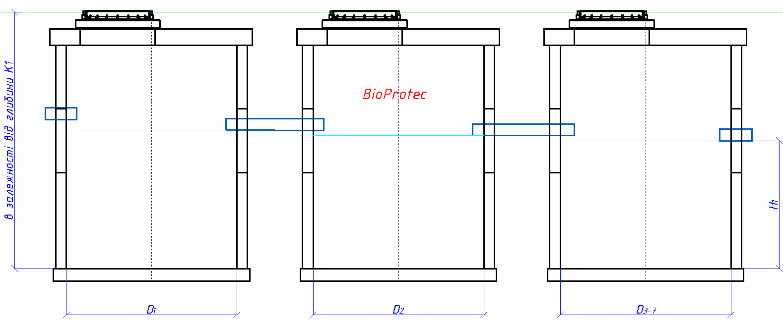 Очисні споруди BioProtec потужністю від 5 м3/добу влаштовуються в залізобетонних резервуарах (колодязях). Вони складаються з двох або кількох залізобетонних герметичних резервуарів, які можна компонувати в залежності від потужності очисних, вимог Замовника та наявної території.