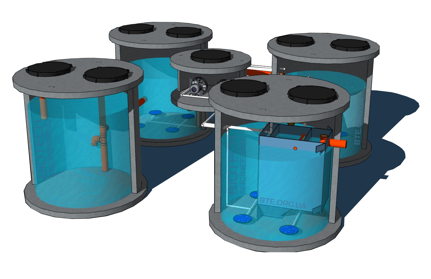 Завдяки залізобетонному корпусу із типових кілець, очисні споруди можуть бути розташовані під проїздами. Обладнання монтується в кільця, сервісний доступ здійснюється через технологічні люки. Основний біологічний процес очищення відбувається за допомогою мікроорганізмів. Для досягнення ефективного очищення стічної води в станцію постійно подається повітря від компресору.